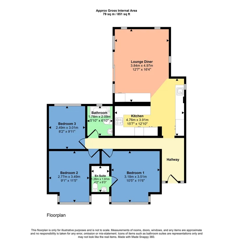 - 16' 3" by 13' 1" (4m 95cm by 3m 99cm), (). Featuring large sliding patio doors to the side, 2 windows to the rear and one to the side. There is also a radiator.